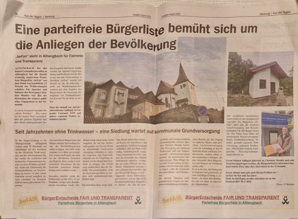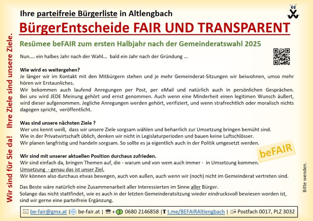 Wer aktiv mitmachen möchte bei unserer parteifreien Bürgerliste „BürgerEntscheide FAIR UND TRANSPARENT“ kommt gerne zu unseren Treffen oder meldet sich unter Tel. 0680/2146858 bzw. be-fair@gmx.at.
